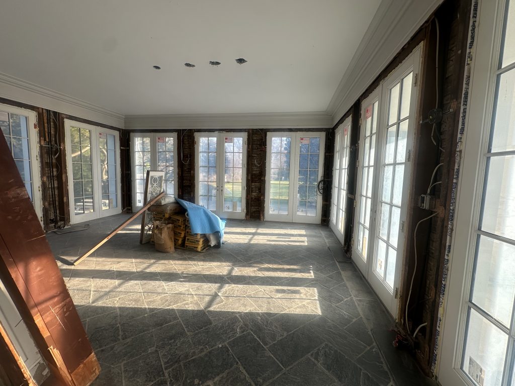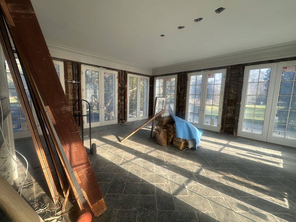 OUR SUN ROOM You may remember it from before the reno started. We changed out the french doors but kept the Belgian stores floors which I love. The fireplace is old but charming I may switch out the current tiles with some of the blue/white delft I am getting in.