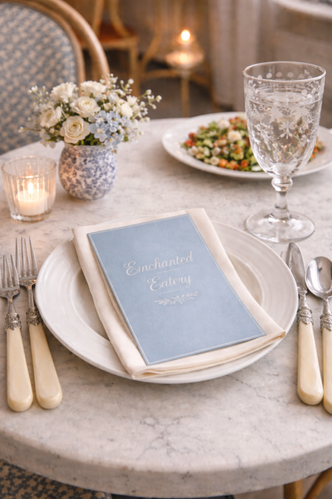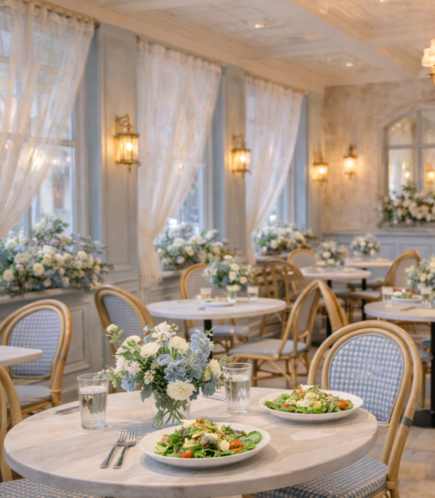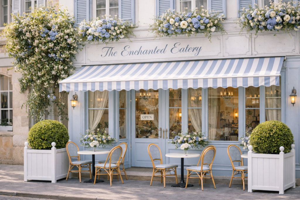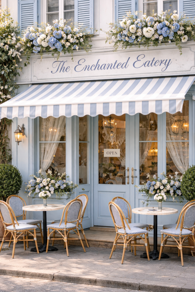 6 MY DREAM CAFE I have always been a dreamer and figure I will continue to be one until I am old and gray. I have for, so long, dreamed of a beautiful charming cafè, I. know just how I would want it to look, the kind of menu I would offer. Its more of a concept, a charming cafe,and then on either side there would be a small florist on one side and a charming home accessories shop on the other. I had such fun playing around with this concept and almost wish I didn’t because now I can’t get it out of my mind:)