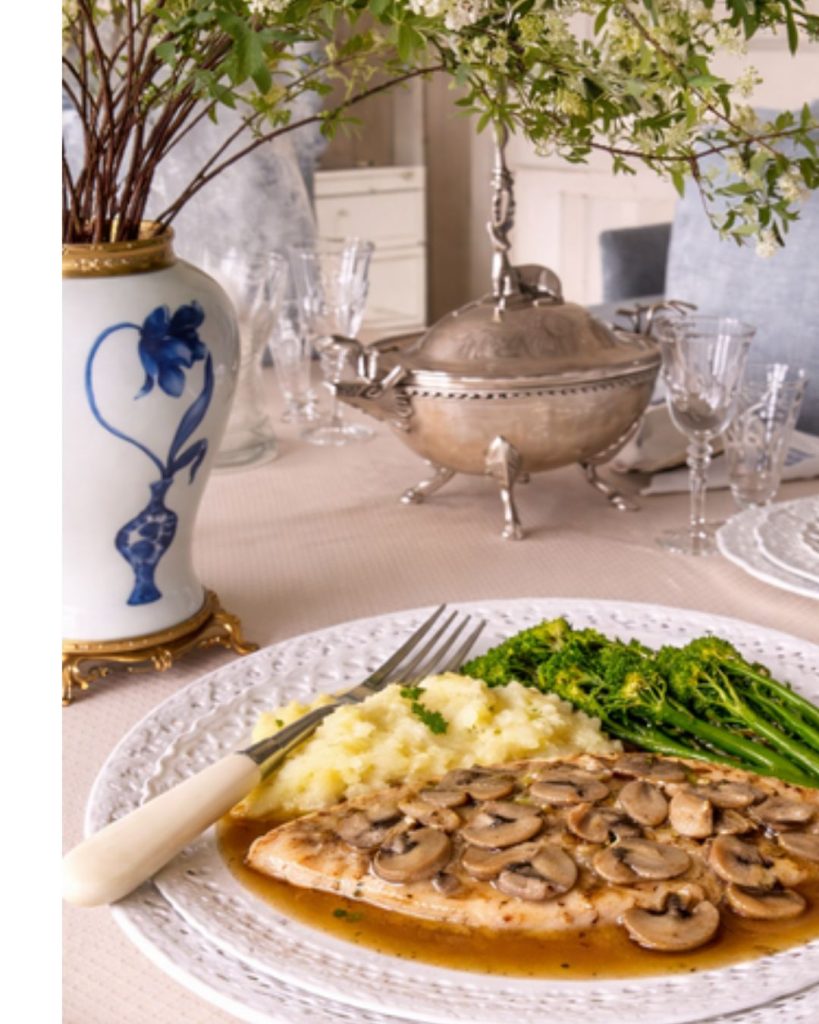 Season the mushroom sauce with salt and pepper and then add the chicken back to the pan and cook for 30 to 45 seconds or until it is warmed. This is great with potatoes, rice or some kind of pasta and a side vegetable. I normally due mashed potatoes and broccoli or string beans.