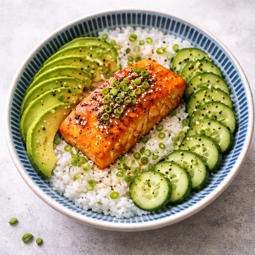 Meanwhile, once almost done, spoon the sushi rice into a bowl (I mix in about 2 TBSP of rice vinegar) and use a spoon to shape it into the bowl, on one side add sliced avocado and on the other the slice cucumbers in center place the fish, add scallions and black sesame seeds over entire dish, and enjoy!